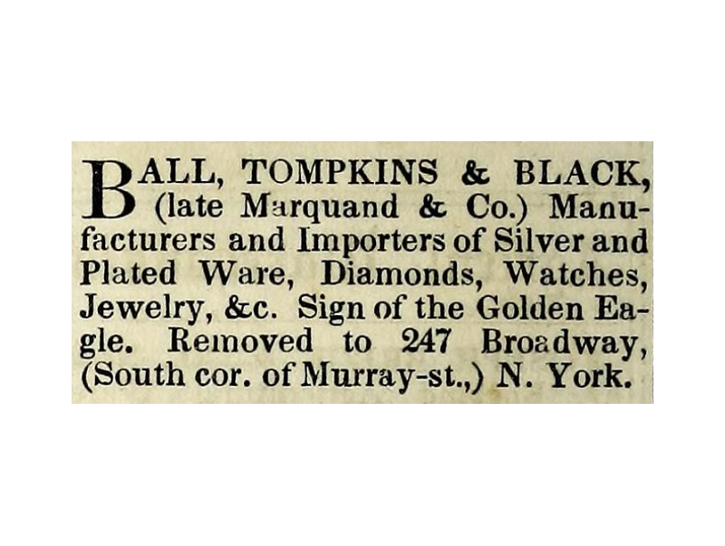 It is around this time that Frederick Marquand experiences some personal hardships. On 24 November 1838 Isaac Marquand, Frederick's father, passes away in Brooklyn, NY. A year later, in 1839, Marquand & Co. is sold to Ball, Tompkins & Black, and the name remains Ball, Tompkins & Black. Then, in 1851, a new business was established as Ball, Black & Co.. At this point, the company that was established in 1826 by Frederick Marquand ceases to exist.