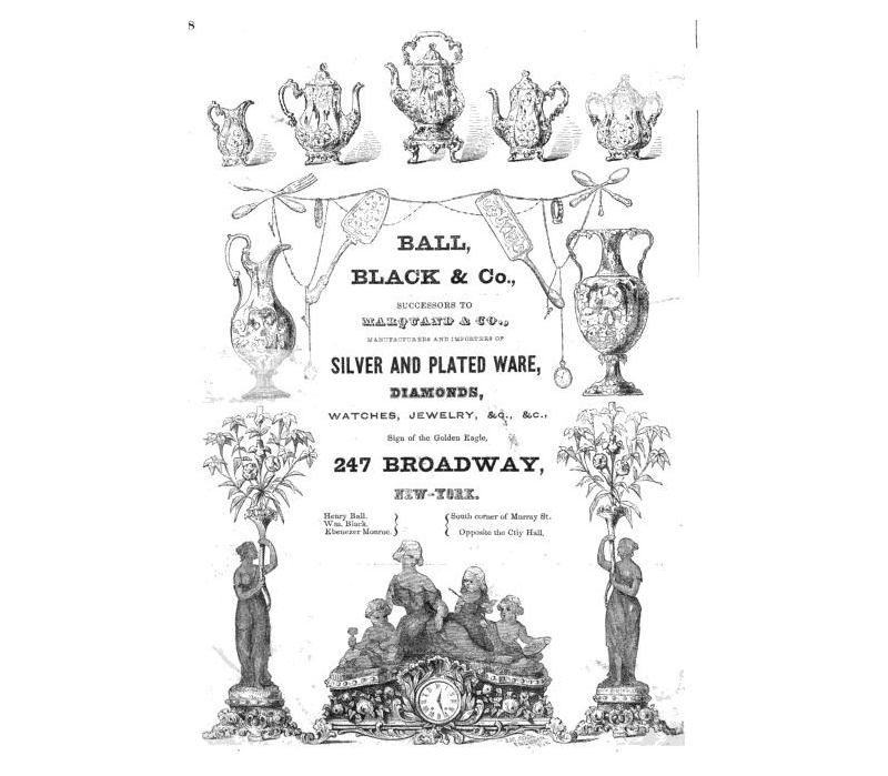 The claim, made by Black, Starr and Frost in their marketing materials, "[In 1851,] the company makes headlines at the London Crystal Palace Exhibition, displaying an exquisite four-piece tea service made of pure gold." This is worded in a manner so as to have truth, but it is deceptively used as marketing. "The Company" here would have been Ball, Black & Co.. The image used by Black, Starr and Frost on their website is of a page from "Gleason's Pictorial Drawing-Room Companion, page 213. This piece was most likely made at 247 Broadway (address of Ball, Tompkins & Black, then Ball, Black & Co.). "The Company" here does not refer to Black, Starr and Frost.